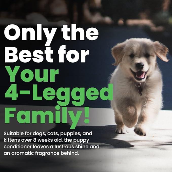 - For Dogs and Cats: Suitable for dogs, cats, puppies, and kittens, over 8 weeks old, the puppy conditioner is enriched with silk protein and vitamins A, C, and E. Available in a 16-ounce bottle, the dog conditioner can be diluted up to a 6:1 concentration