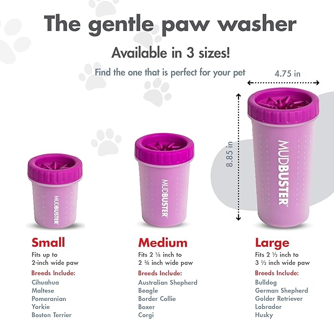 - Available in 3 Sizes: The Dexas MudBuster ensures a perfect fit for any dog with three size options: Small (4.3" tall, 3.65" wide, for paws up to 2"), Medium (6" tall, 4" wide, for paws between 2.5"–3.5"), and Large (8.85" tall, 4.75" wide, for paws over 3.5"). Clean paws with ease, no matter your dog's size!