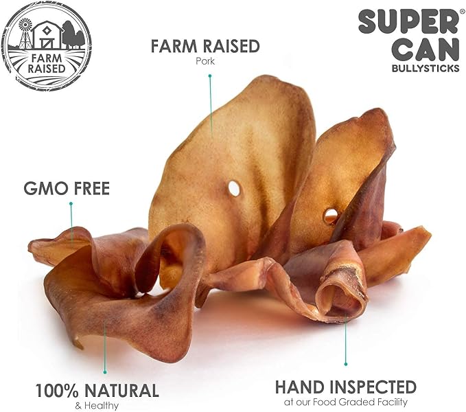 SUPER CAN BULLYSTICKS Natural Whole Pig Ears for Dogs (100 Count) - 100% Natural Pork Ear for Dogs - Easily Digestible Natural Dog Chews for Medium-Large Dogs