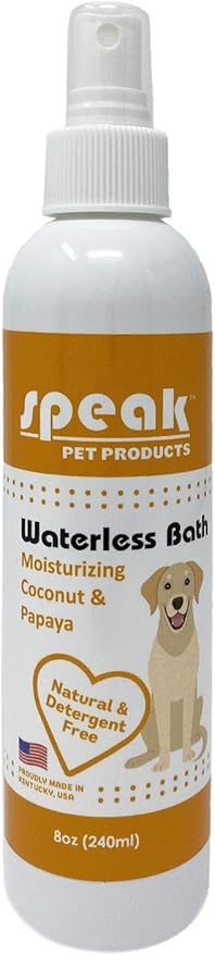 - Contains (1) 8 oz bottle of Speak Pet Products Moisturizing Coconut and Papaya Waterless Bath Spray