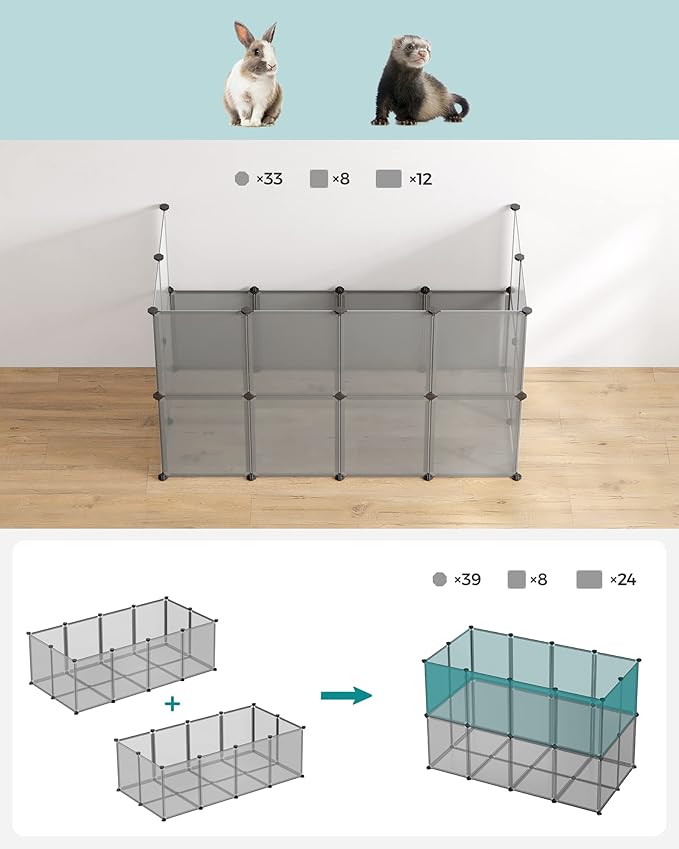 - [Customizable and Expandable] Arrange this flexible pen in an L-shape to fit your corner space or stack them into a 2-story pet house within the limit of the included parts. Please see the recommended assembly methods below for further details