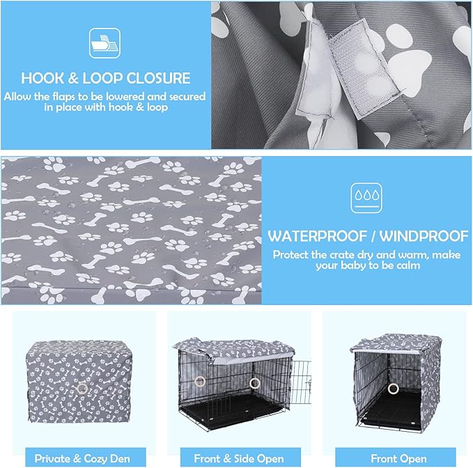 - 2: Waterproof fabric will keep your crate dry. Open Panel simply folds back to allow your crate door to open & close. Made for indoor and outdoor use.
