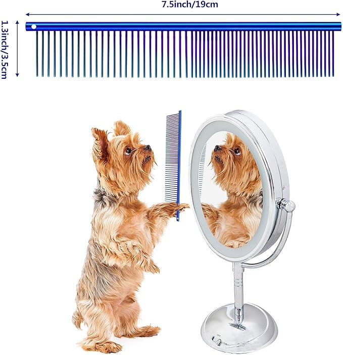 - 2 Different densities: the steel teeth of these dog combs have two different densities, the dense part can be applied to combing the soft hair near the eyes, ears and legs, and the sparse part can open the tangled hair for a fluffy hair; In addition, the ends of the stainless steel teeth are polished and rounded, which will not harm the pet's skin