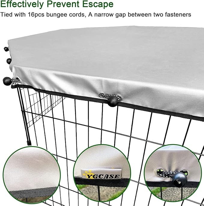 - PREVENT ESCAPE- The protective net is tightly tied with 16pcs bungee cords, so there is just a narrow gap between two fasteners. It effectively prevents the puppy from jumping up and out of the pen