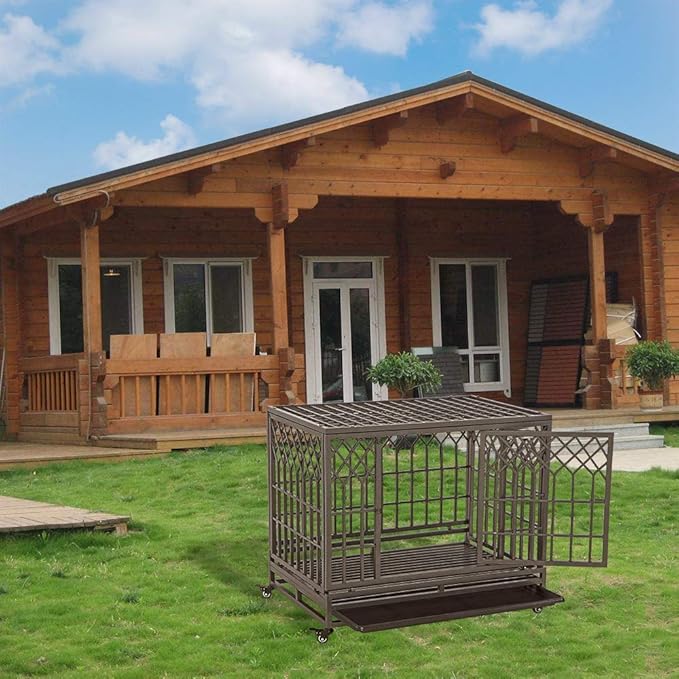 • 【Size and Aftersales】 38"L X 26"W X 32"H, Brown. The height of the dog cage with wheels is 32 inches, and the internal height is 25.6 inches. Suitable for most large dogs, perfect for indoor and outdoor use. If any quality problem within 3 years, please contact us. We will provide with the most satisfactory solution!