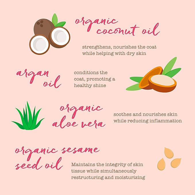 - Organic Hydration: Enriched with Coconut, Sunflower Seed, Argan Oils, and Aloe Vera, it deeply moisturizes and revitalizes pet fur.