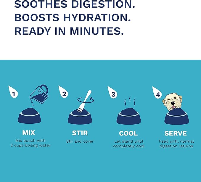 - NO MORE COOKING - JUST ADD WATER! When dogs experience digestive upset, including vomiting and diarrhea, vets recommend feeding a “bland diet” to soothe the digestive tract until normal digestion is restored.