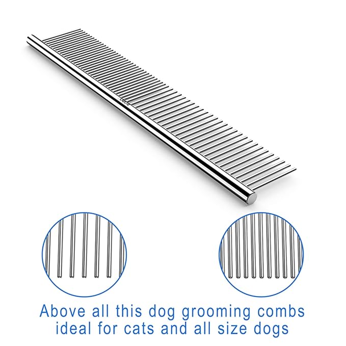 - PREMIUM MATERIAL: The dog grooming comb is made of premium stainless steel, this steel comb teeth is smooth and durable, corrosion resistant and will not fade, also benefit for avoiding static electricity when used.