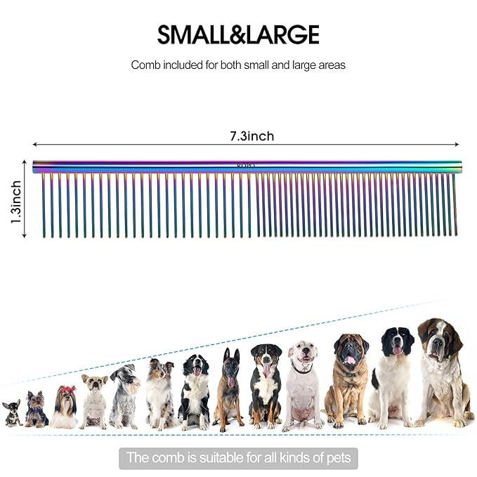 - PREMIUM MATERIAL: The dog grooming comb is made of premium stainless steel, this steel comb teeth is smooth and durable, corrosion resistant and will not fade, also benefit for avoiding static electricity when used.