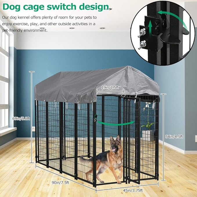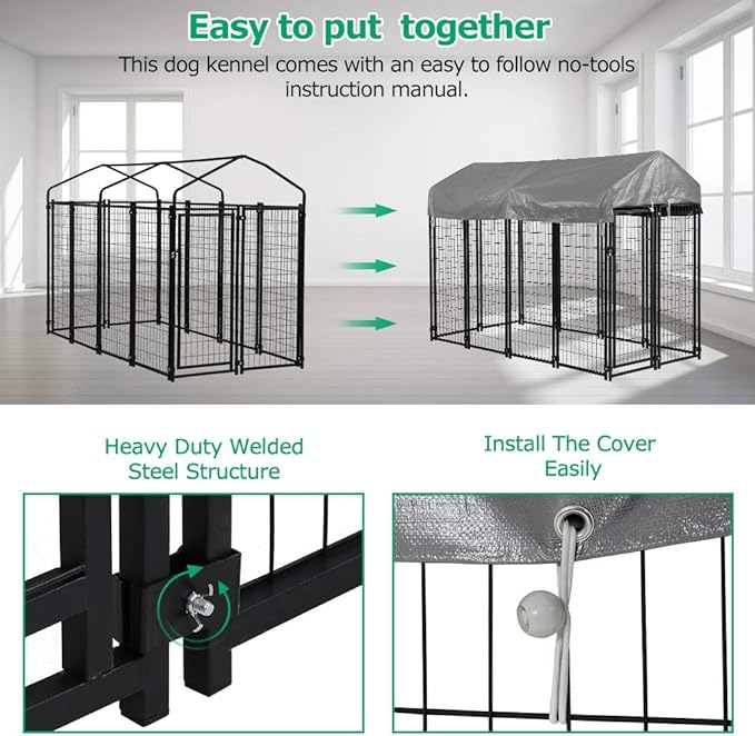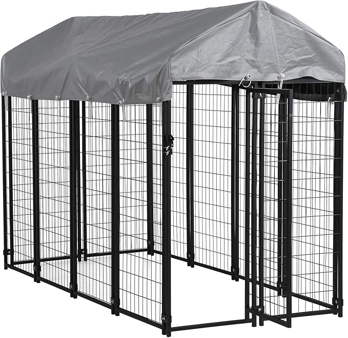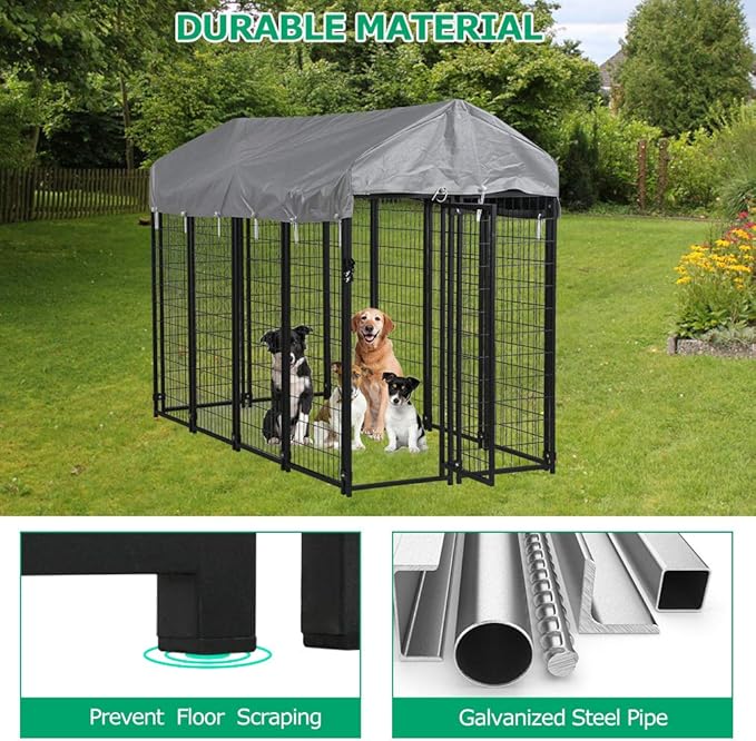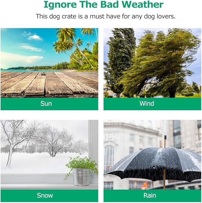 - 【WATERPROOF COVER INCLUDED】The waterproof cover of heavy duty dog crate and steel roof frame fit the outdoor dog cage perfectly and the enclosed ends provide your pet with full protection from sun, rain, snow and debris. Added UV protection prevents ripping, cracking, fading or peeling giving you years of worry-free use. The roof pitch of pet crate allows for water, debris and light snow to run off instead of accumulating on the roof. dog crate dog cage pet crate.