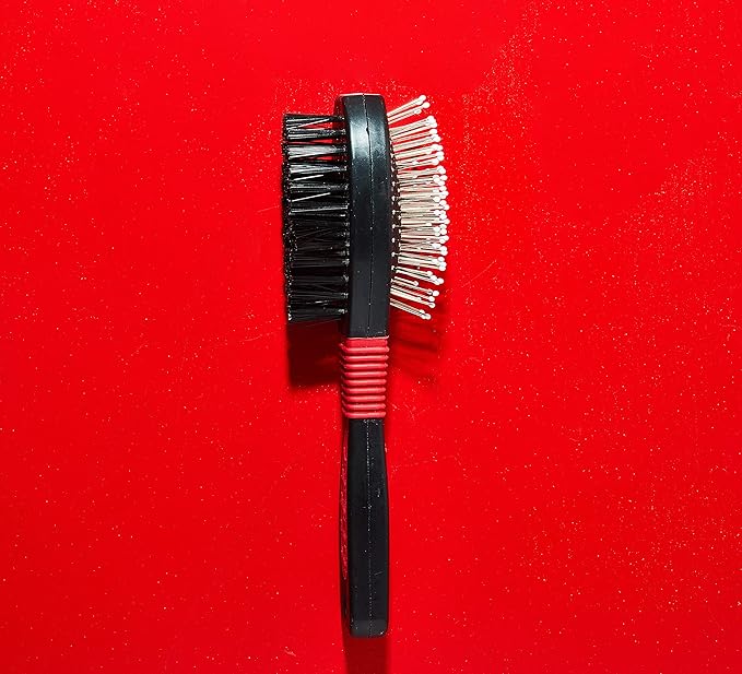 - DUAL-SIDED BRUSH: Use the dense nylon bristles to redistribute natural oils to promote a healthy, shiny coat. use the side with the widely spaced pins to remove loose hair and detangle knots.