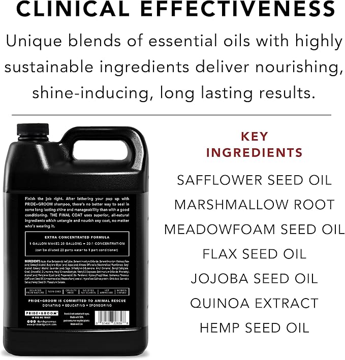 - THE FINAL COAT CONDITIONER: After lathering your pup up with PRIDE+GROOM shampoo, seal in long lasting shine and manageability with this all-natural conditioner, untangling + nourishing any coat, no matter who’s wearing it.
