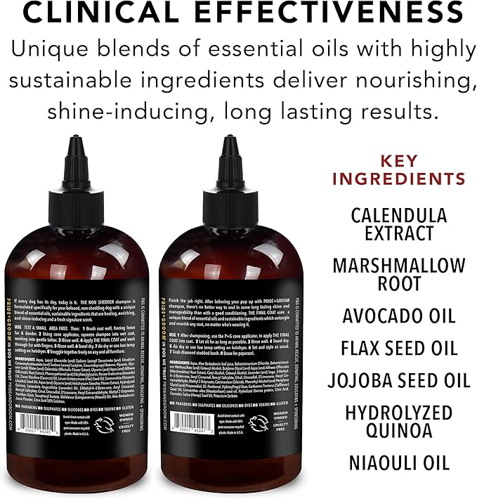 - PRIDE+GROOM BOX SET: Beautiful gift box that includes THE NON SHEDDER shampoo and THE FINAL COAT conditioner packed with essential oils & smoothing ingredients for a non shedder’s hair coat.
