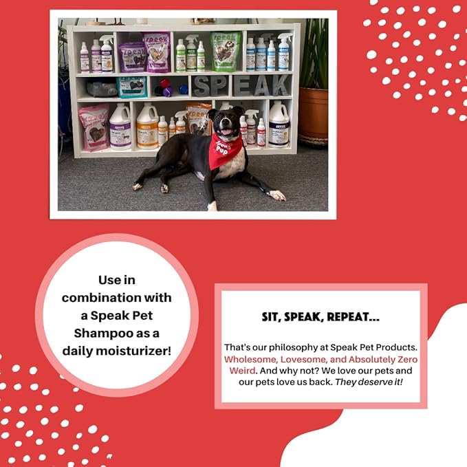 - Contains (1) Gallon of Speak Pet Products Soothing Cherry Almond Oatmeal Conditioning Spray for dogs