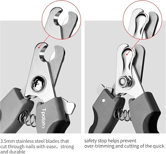 - MEDICAL STAINLESS STEEL BLADES: Say goodbye to broken, delaminated and chipped nails! The Tpotato dog nail clippers are made of high quality medical stainless steel blades with a thickness of up to 3.5mm, making them easy to cut and clean to keep you and your pet at ease. The included nail file is the icing on the cake, throwing a perfect shine on nails.2024 authoritative survey shows that 95% of veterinary clinics highly recommend this burr-free trimmer.