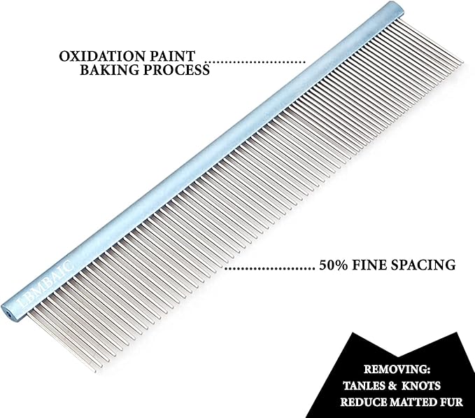 - 【Double-Sided Grooming.70%-80% Efficient Removing Tangles,Knots and Brushing Matted Fur.】>>Coarse Comb wide Tooth: our metal dogs and cats comb can be used for large areas grooming or brushing for tangled hair combing.The back, the tail, the limbs. Finer Comb long Tooth: Great for detailing and deshedding small areas around the face,make it look smoother and cleaner.It's Professional pet comb with fine tooth.