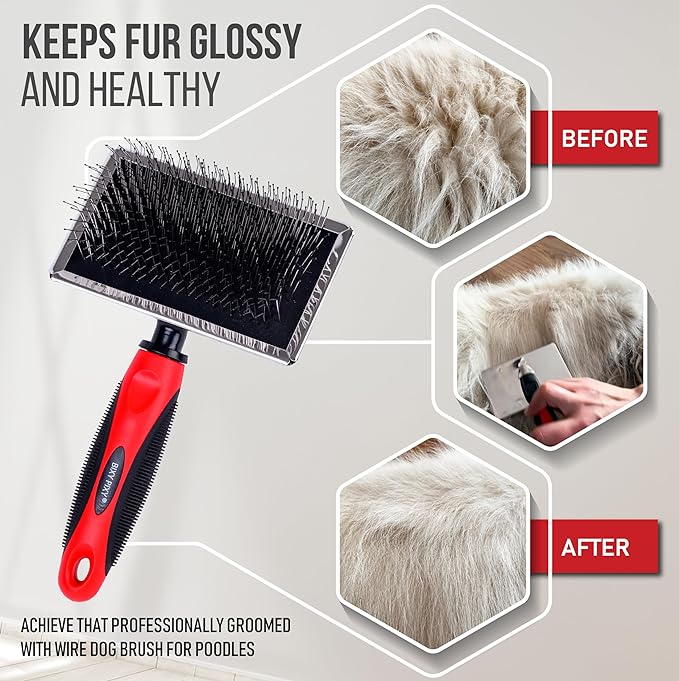 - 💚 FOCUS ON ALL COAT TYPES - Dog slicker brushes for grooming Long Haired Dogs and Curly Hair Breeds such as - Goldendoodles, Labradoodle, Samoyed, Pyrenees, Cockapoo, Collie, Chows, Labs, Golden Retrievers, Bernedoodle, Bichon, Pomeranian, Toy Poodles, Afghan Hound, Newfoundland, Schnauzer, Malamute, Maltese, Sheepdog, German Shepherd, Maltipoo, Bernese Mountain, Husky, Poodoodle, Spaniel and it's a great dog brush for poodles.