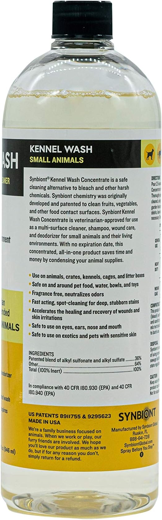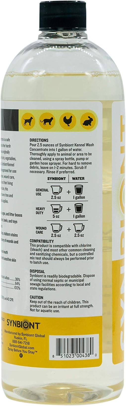 - BLEACH ALTERNATIVE - Unlike traditional toxic sanitizing steps such as bleach or chlorine, Synbiont Kennel Wash allows for an environmentally friendly alternative to cleaning that doesn't require re-entry restrictions, is non-corrosive and can be used freely around your pets.