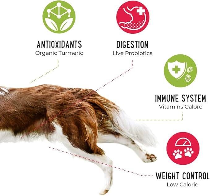 - CANINE HEALTH BOOST: Happy, Healthy Dog Food Topper is a health boost for your furry friends. An excellent source of collagen and naturally occuring taurine, this kibble topper will keep your pup’s mobility, skin and coat as well as their digestive, immune and cardiac systems healthy and robust.