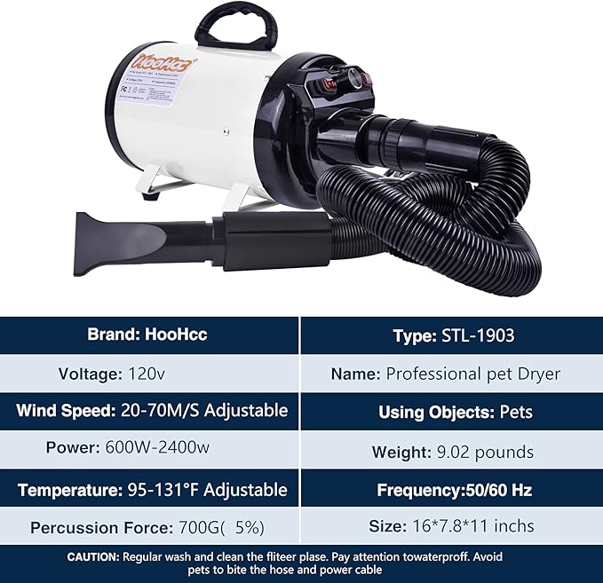 - ADJUSTABLE SPEED & POWERFUL BLOW FORCE - Our 2021 upgrade Professional high velocity dog dryer blower pet hair dryer equipped with a powerful and stable motor. Output power: 600W-2400W. Stepless Adjustable Speed. Whether it's a giant dog or mini cat, it can quickly dry. You can choose different wind level with your pet size. Give your lovely pet a thorough dry after shower