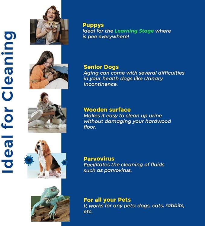 - Perfect for cleaning up from puppies in the learning stage with frequent urine accidents, to older dogs with urinary incontinence and illnesses like parvovirus, facilitating quick cleanup of vomit and diarrhea.