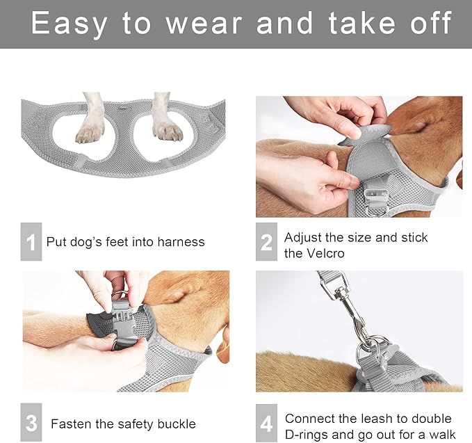 - 【Easy to Wear】The step-in design is easy to put on and off, just adjust the harness, affix the velcro to fit your dogs, fasten the buckle, then connect the leash and ready to walk.