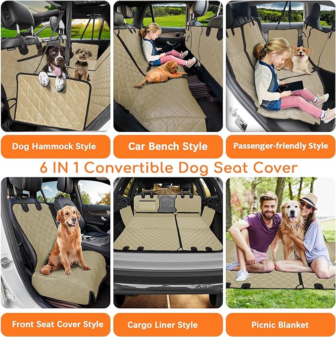 - 6 in 1 MULTIFUNCTIONAL DOG CAR SEAT COVER: The 60/40 split dog seat cover can be easily transformed into a dog car hammock, bench seat cover, passenger-friendly style, pet front seat cover, trunk cargo liner, or picnic mat. Standard size: 53" W x 59" L. It also allows children and pets to share the back seat together. (Note: the dog seat cover does not come with a hard bottom)