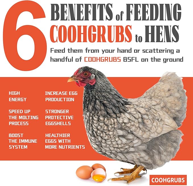 - Stronger Eggshells, Healthier Hens: Packed with the perfect balance of calcium and phosphorus, COOHGRUBS BSF larvae deliver up to 100x more calcium than dried mealworms. This extra boost helps your laying hens produce harder eggshells, stronger bones, and better hatch rates.