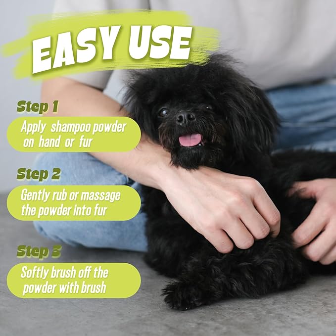 - Easy Use- This dry shampoo for dogs and cats is really easy to use. Sprinkle some powder on your hand or on the pet, massage the fur gently and make sure the powder reach the root of hair and brush them out. No more mess and wet pets nor air dryers after bathing.