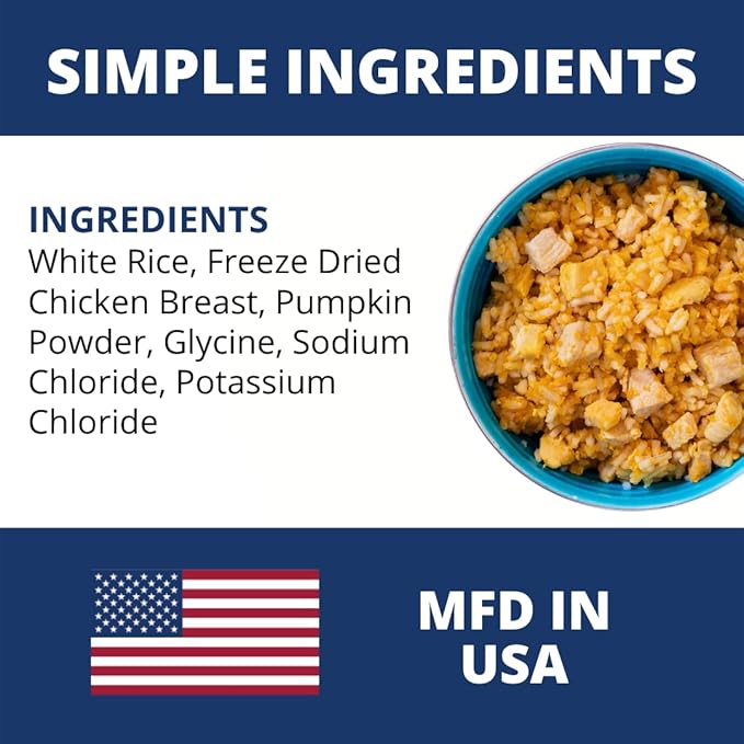 - OUR AWARD-WINNING BLAND DIET is freeze dried and contains white rice, and 100% human grade white meat chicken, raised cage free with NO antibiotics or hormones. Enhanced with a powerful electrolyte blend to boost hydration and energy.