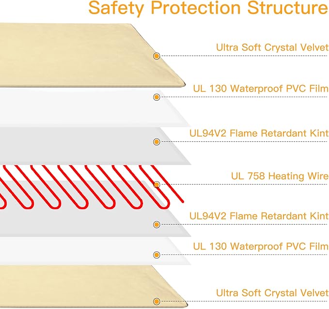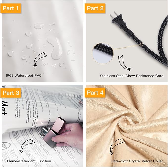- ❤【Safety and Secure Structure】7-layer protective structure with UL-certified heating wire protect pets from burns. Soft PVC envelope with waterproof and flame-retardant function. Built-in intelligent temperature sensor in the heating pad to prevent overheating to protect pets. Don’t let your pets lay on the pet heating pad without a plush cover.