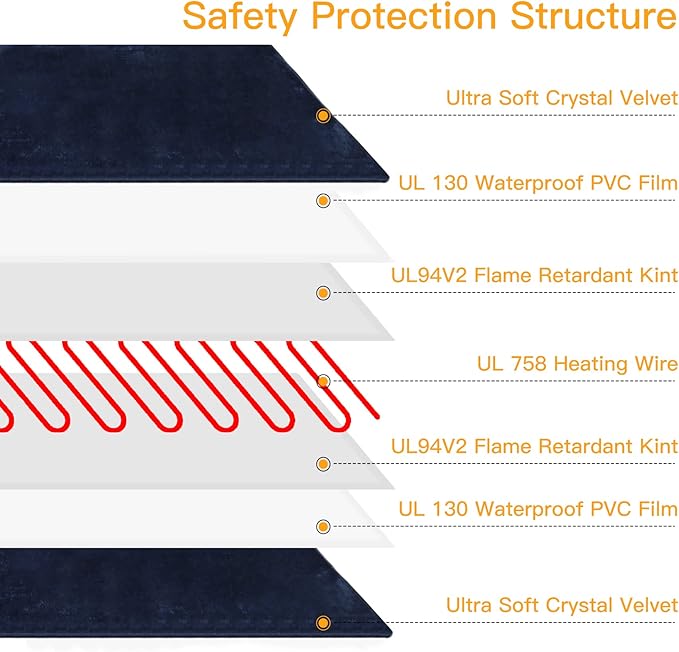 • ❤【Safety and Secure Structure】7-layer protective structure with UL-certified heating wire protect pets from burns. Soft PVC envelope with waterproof and flame-retardant function. Built-in intelligent temperature sensor in the heating pad to prevent overheating to protect pets. Don’t let your pets lay on the pet heating pad without a plush cover.