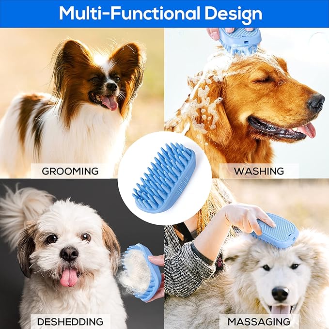 - 【EASY TO HOLD】The dog wash brush surrounding bump-slip back allows to keep the dog scrubber steady safely within your grasp. Increasing the weight of the pet bath brush a little to ensure more easily and comfortable for us to hold it when using, provides you great control even when curry brush is wet.