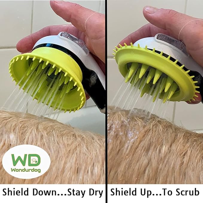 WD Handheld Shower Brush with On/Off Switch | Shield Water While Brushing and Washing Simultaneously | Dog Washing Shower Attachment