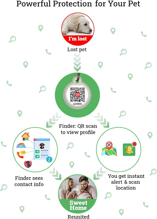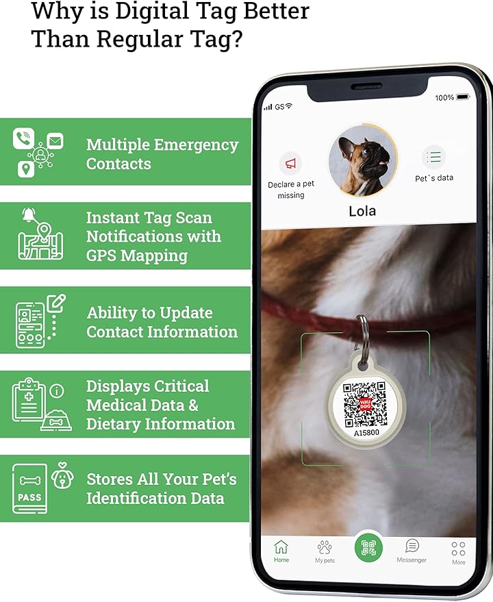 - Modern Digital Solution - QR dog tag simplifies process of finding owner. You can link dog id tag to mobile app, add multiple contacts & change them at any time. Adding dietary & health info will help the finder to take care of your pet.