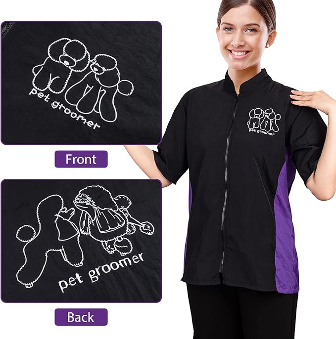 - 💜💜【Grooming with Style】-- With delicate embroidered poodle pattern, which gives a tactile appeal to this jacket. Meanwhile, not easy to fade or fall off. This lightweight jacket is made to keep you clean and comfortable all day with the unique addition of a purple trim, for an extra splash of style.
