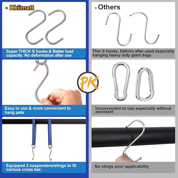 - Warm tips Kkiimatt brand value and adopt the customers’ feedback, we invent the 2nd version high quality S-HOOKS x2 which are thicker and stronger. Besides, due to the various producing version u may received CARABINERS x2 OR S-HOOKS x2. Nail clipper x 1 safety block design, nail file x 1, double row pet comb for short and long hair x 1, sling x 2 for irregular bars or too thick bars. These items and dog nail hammock is a perfect combination, which makes your work easy & comfortable.