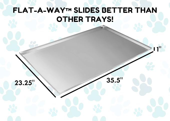 - Unique Patent pending FLAT-A-WAY design. Slides in and out so easily! You'll have no more broken, cracked or chewed up kennel liners with the stainless steel Replacement Dog Kennel Tray from Red Hound Auto. Includes 1 all metal crate pan (kennel and dog not included).