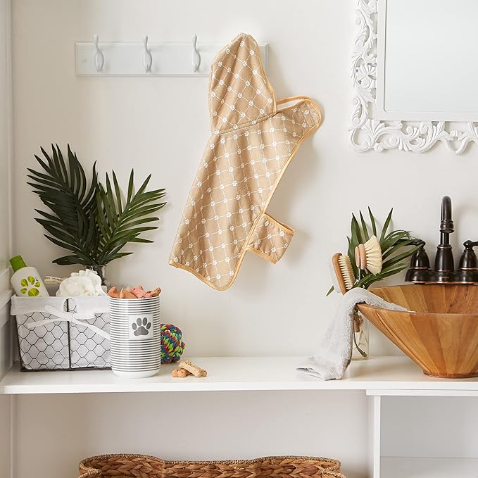 Bone Dry Pet Robe Collection, Trellis Paw Print, Absorbent Microfiber Bath Robe with Adjustable Closure for Dogs & Cats, Small,Taupe