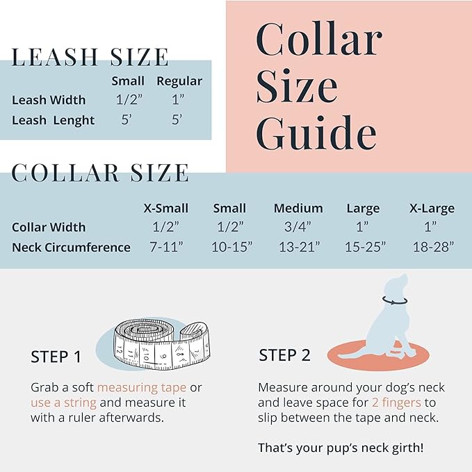 - 🤍 To ensure you order the correct size for your dog, PLEASE MEASURE your dog’s neck before ordering a collar. You can use a soft tape measure or use a string and measure it with a ruler - this will ensure you choose the perfect size for your furry friend.