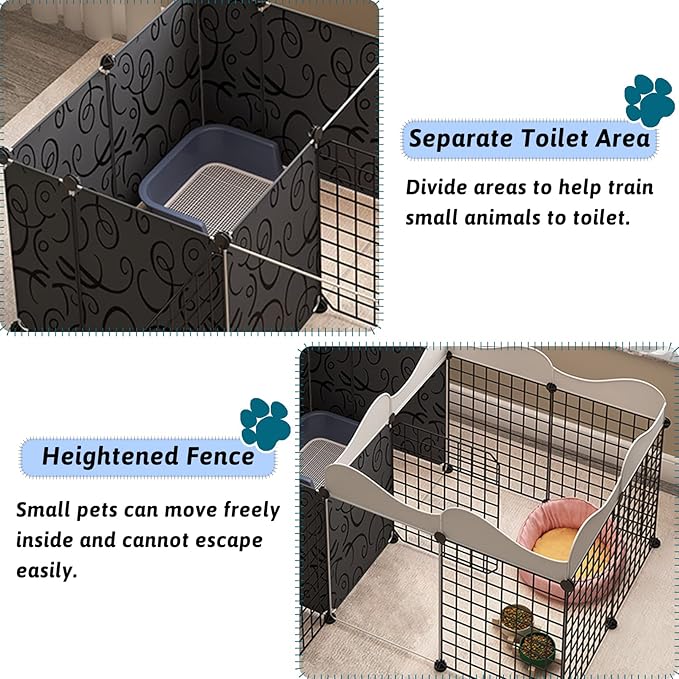 - 【Raised Fence】: The raised fence of rabbit playpen with door can effectively prevent pets from climbing and escaping. The grid panel allows you to observe the status of pets in the fence from multiple angles. Even if you are busy, you can make them play happily.