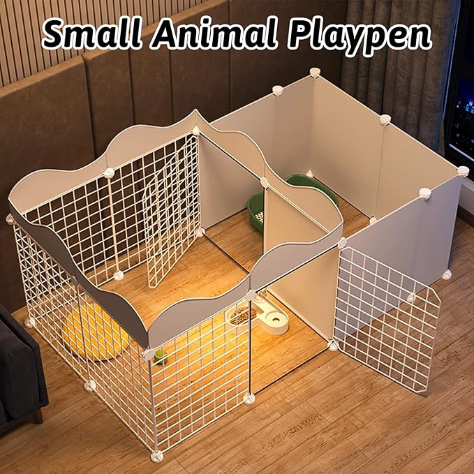 - 【Safe Pet Play Space】: Guinea pig playpen is made of plastic and iron, composed of 14 panels, and a spacious pet playpen, allowing your little pets to play comfortably. Package content 14 x fence and anti-escape panel, 1 x wooden hammer, 26 x connector and 1 bundle of cable ties.