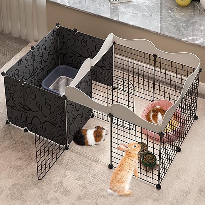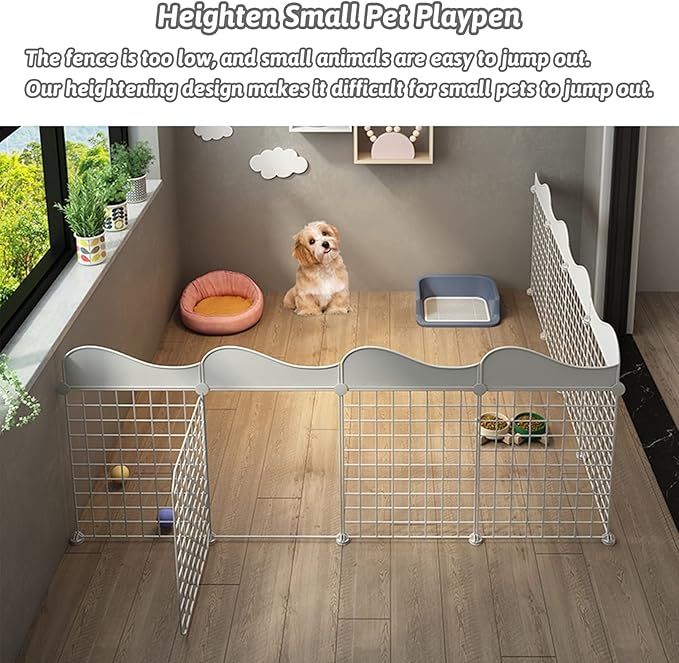 - 【Safe Pet Play Space】: Guinea pig playpen is made of plastic and iron, composed of 14 panels, and a spacious pet playpen, allowing your little pets to play comfortably. Package content 14 x fence and anti-escape panel, 1 x wooden hammer, 26 x connector and 1 bundle of cable ties.