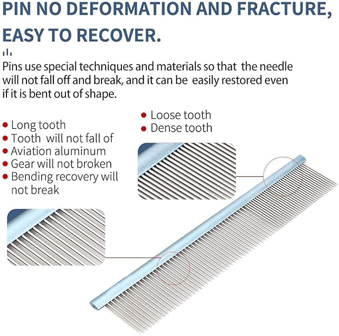 - 2.【Strong,Shiny and Unique Design High Effectively To Slove Tangles Problem.】 ❆ Coarse Comb wide Tooth: our dog metal comb can be used for large areas grooming or brushing for tangled hair combing.The back, the tail, the limbs. Finer Comb long Tooth: Great for detailing and deshedding small areas around the face,make it look smoother and cleaner.It's Professional pet grooming comb with fine tooth.