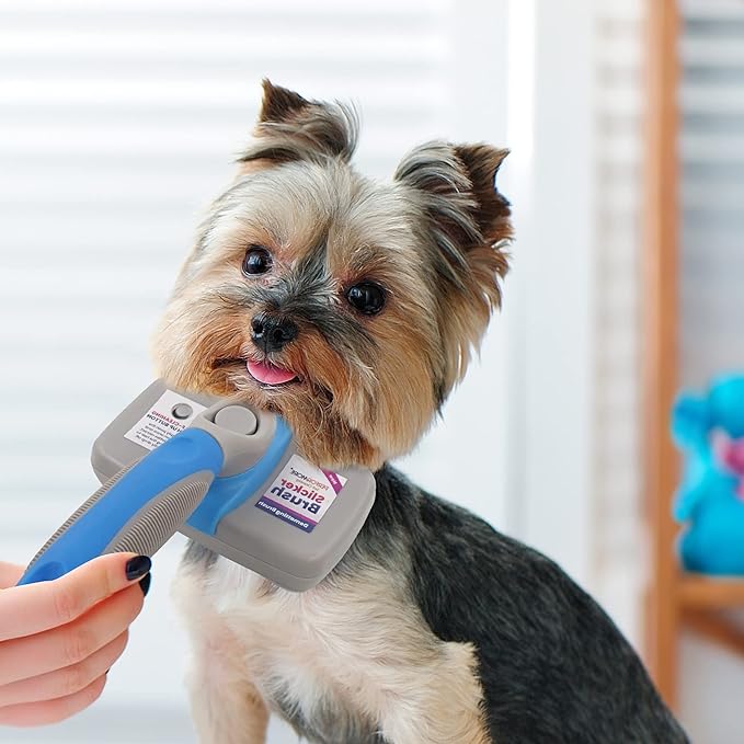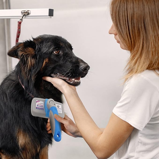 - Self-Cleaning Slicker Brush — Only by a click of the button, the hair can be easily removed from the pet grooming brush. The bristles retract back into the brush, and the hair easily slides off the brush.
