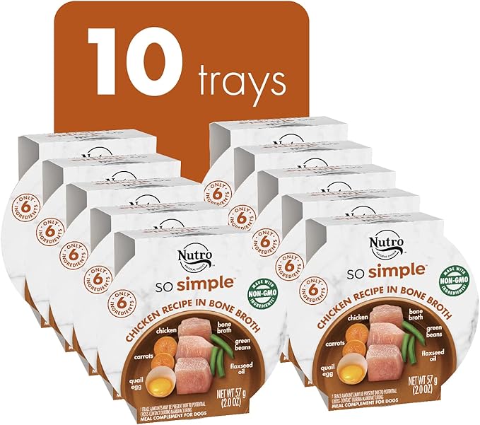 - Contains: One (1) 10-count pack of 2 oz. tubs of NUTRO So Simple Meal Complement Wet Dog Food Chicken Flavor Recipe in Bone Broth.