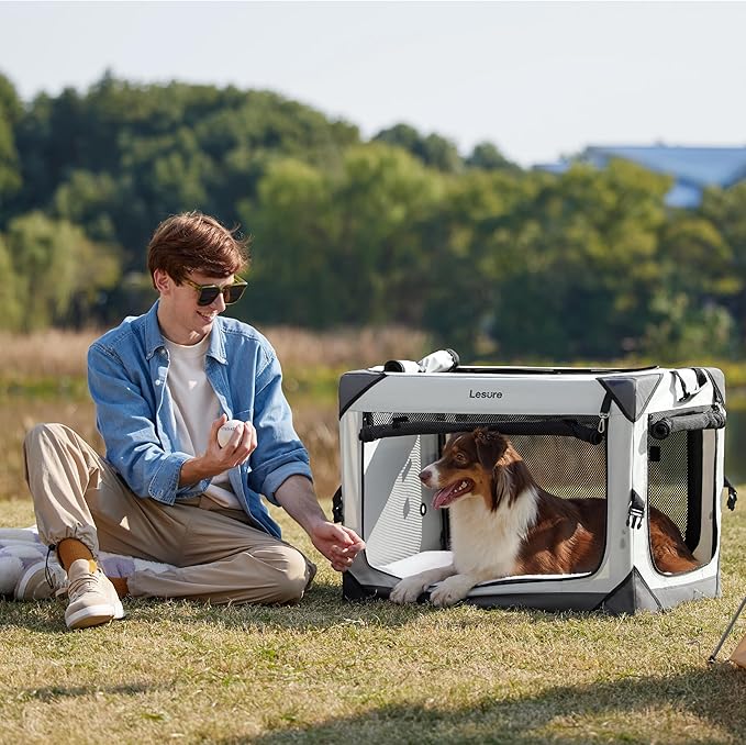 Lesure Collapsible Dog Crate - Portable Travel Kennel for Medium Dog, 4-Door Pet Crate with Durable Mesh Windows, Indoor & Outdoor, Light Gray