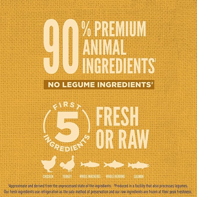 - The first five ingredients are fresh or raw chicken, turkey, whole herring, whole mackerel and salmon to provide your dog with essential protein, vitamins and minerals, as well as grains sourced from non-GMO crops