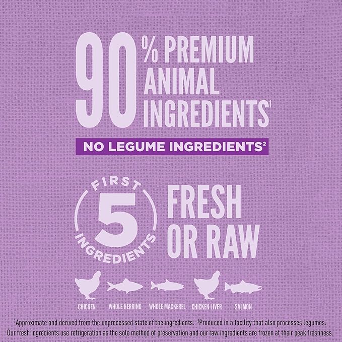 - The first five ingredients are fresh or raw chicken, whole herring, whole mackerel, chicken liver and salmon with protein, vitamins and minerals