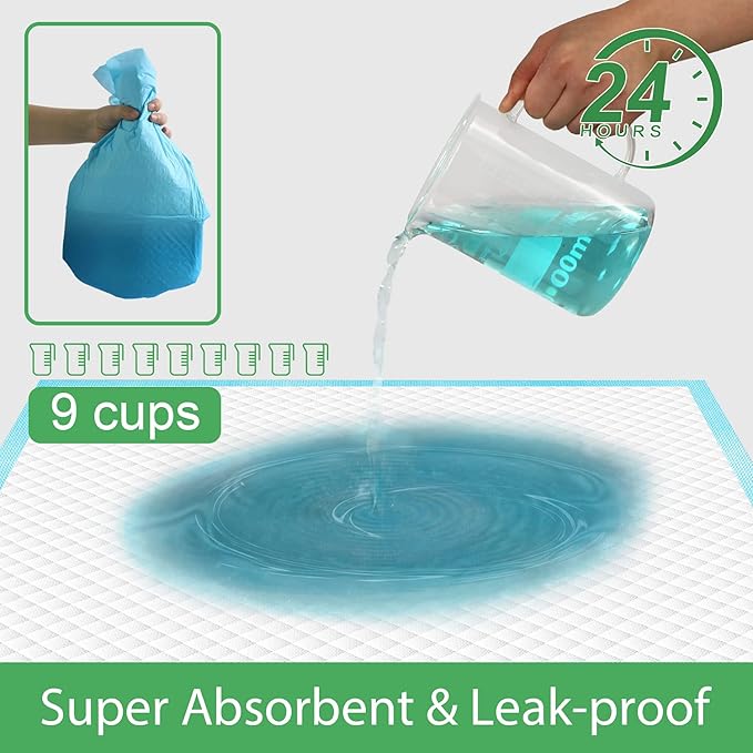- Leak-proof Protection to Keep Your Home Clean: Each of extra large dog pads features the new upgraded plastic backing (thickened PE film) which is much more leak-proof, tear-resistant, and durable than most pet pee pads in the market as the last-layer of the puppy training pads. It can protect your floors, carpets, sofas, chairs, mattresses, beds, etc. from the urine damage by blocking leaks. It holds up to 9 cups of liquid.